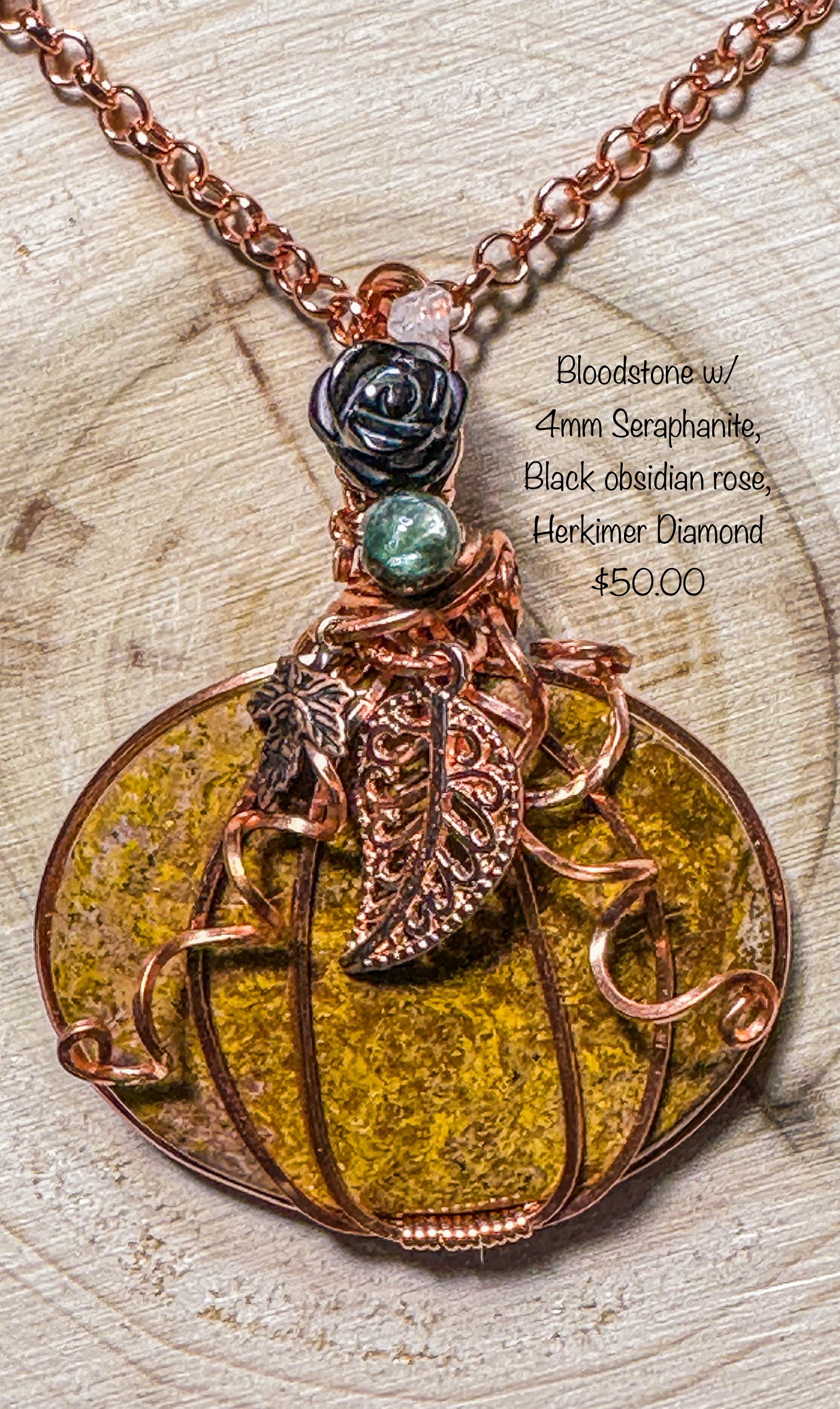 •Bloodstone Necklace accented with 4mm Seraphanite a Black Obsidian Rose and Herkimer Diamond