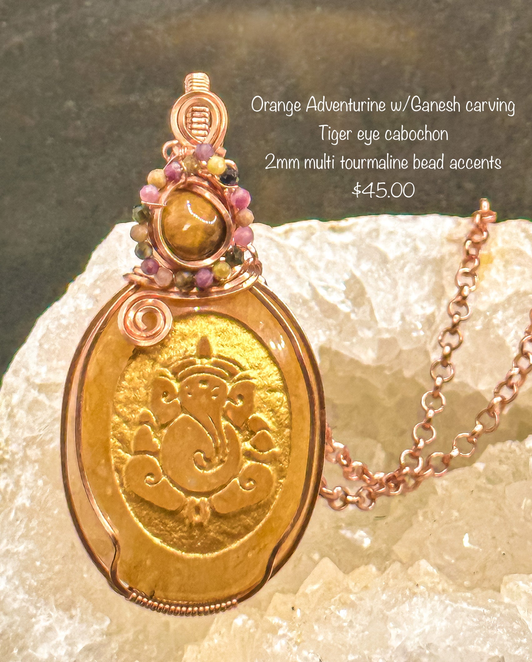 Orange Aventurine with Ganesh carving accented with a Tigers Eye Cabochon and 2mm Multi Tourmaline beads