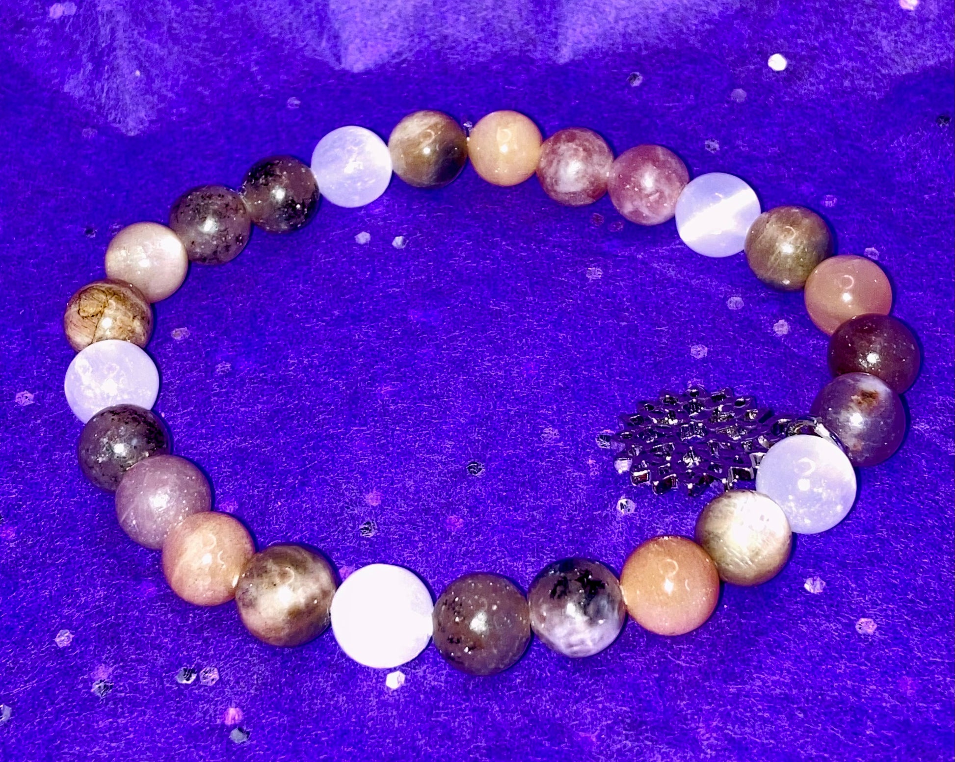 Beautiful Bracelet featuring Sunstone, Black Sunstone, Lepidolite, Cat Eye Selenite , Angel Aura Quartz, Cat Eye Selenite and accented with a silver “Sun” charm.